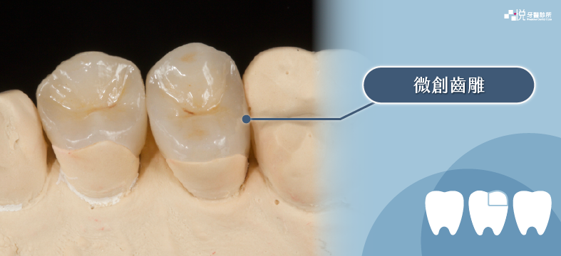 微創齒雕是新式補綴技術,醫師利用口內取模,送至專業技工所雕琢出與牙齒缺損部分大小相同的全瓷修復物。