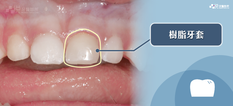 當乳牙門牙蛀牙範圍大或有根管治療後,會建議以樹脂牙套保護本來脆弱的乳牙,樹脂牙套的材質是全包覆式複合樹脂,為牙齒顏色適用於前牙美觀區。