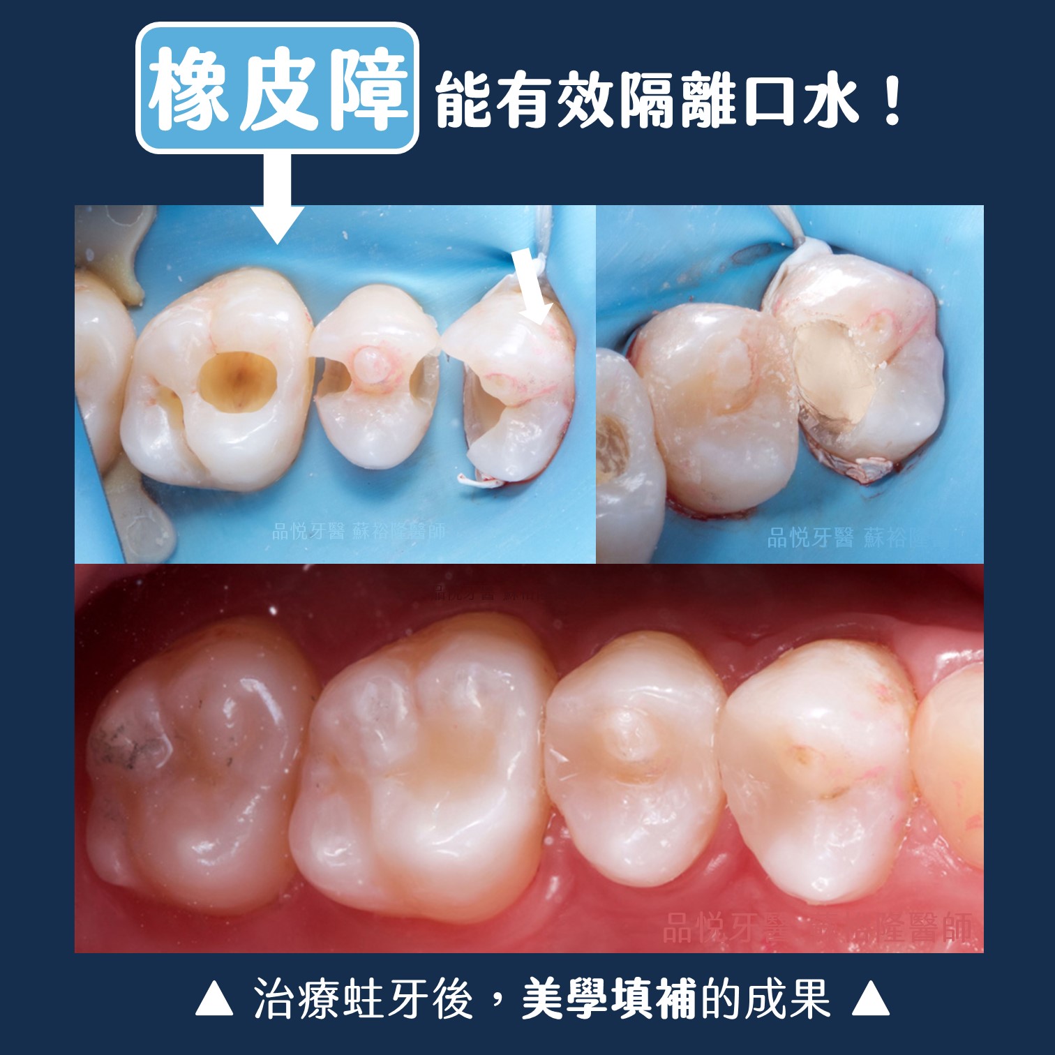 ⽽橡皮障是目前來說最適合用來隔離口內水份的器材,裝設橡皮障之後不僅填補位置會非常乾燥,而且也可以避免水、粉塵、器械進入口中,好處多多。