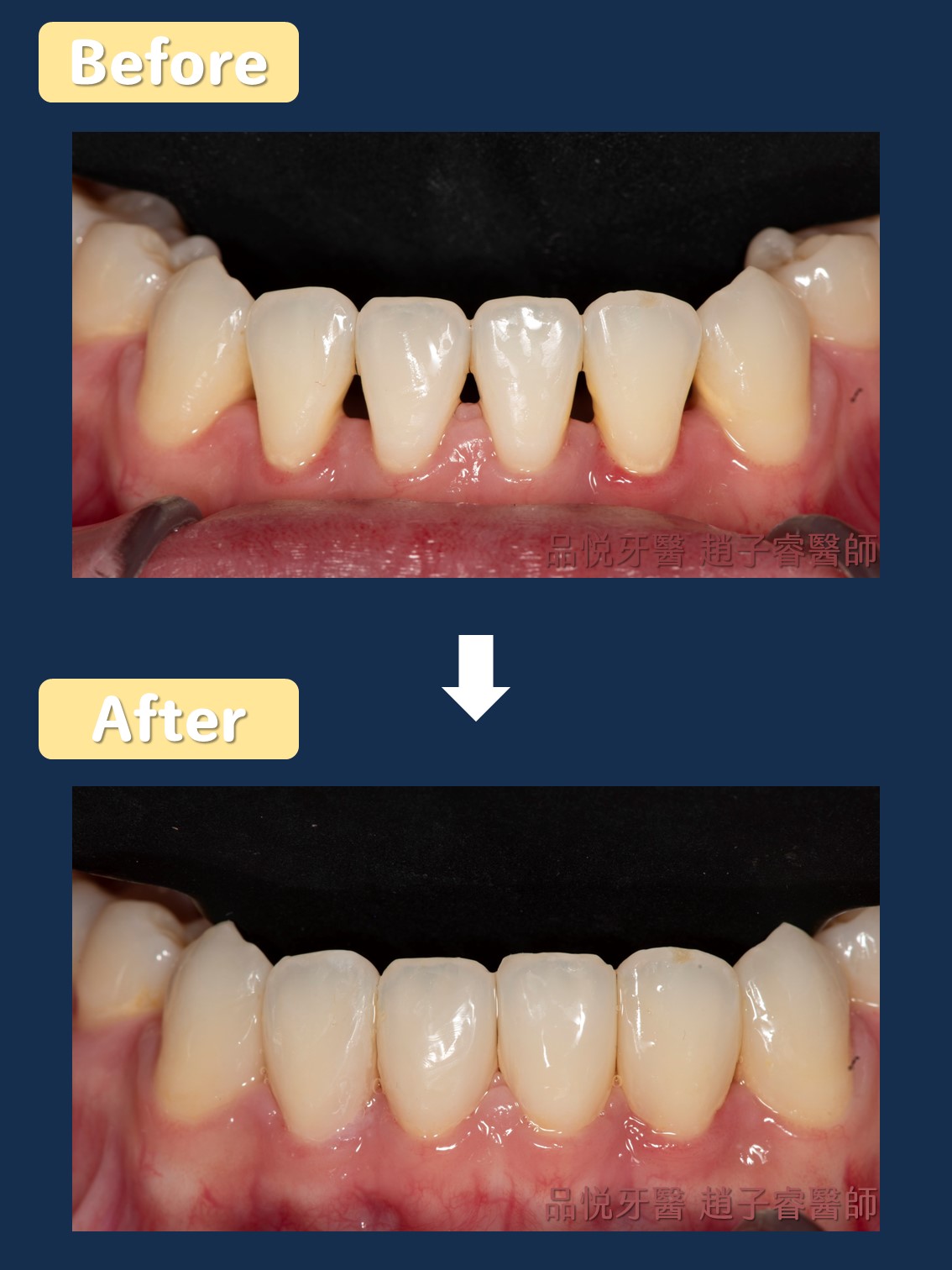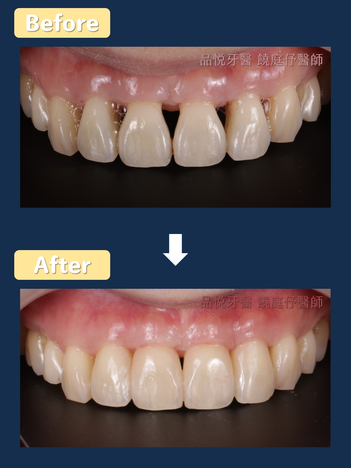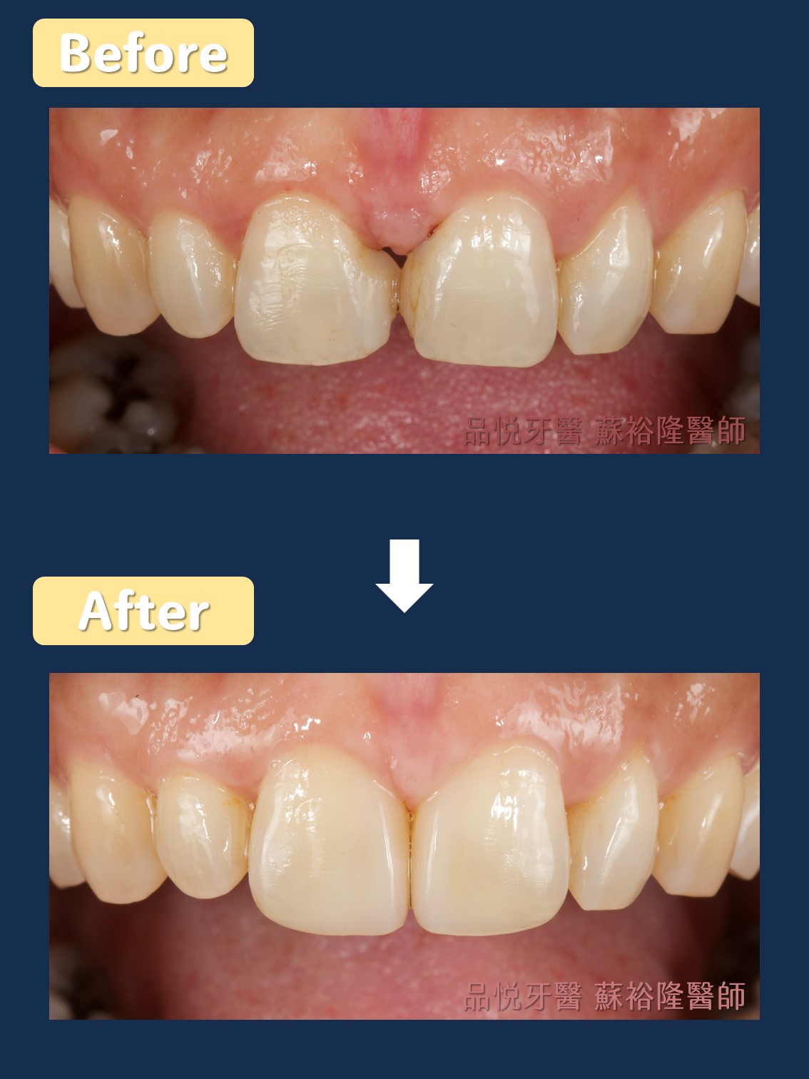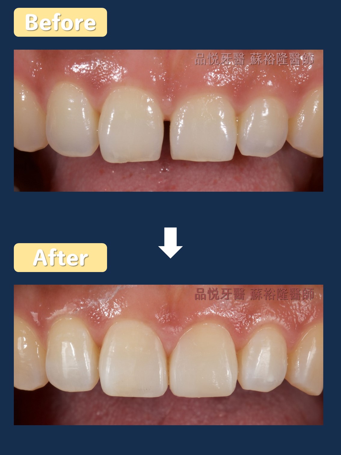 牙縫過⼤的情況,美學樹脂補牙是非常適合的適應症。⼀般會考量到牙齒正常的長寬比例,所以有可能需要針對牙齒的長度做改變,例如修整牙齦或切端增長。