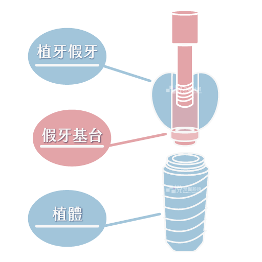 植牙假牙、假牙基台與植體用一根螺絲連接,一體成型,口內不需黏膠。